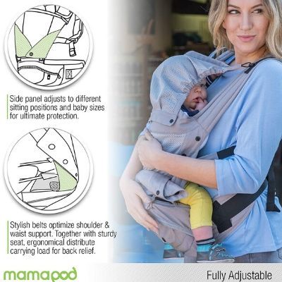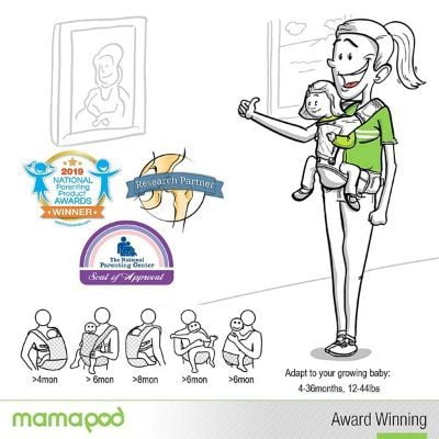 Adjustable Leg Opening: The front panel side extension can also be adjusted for a snug leg fit for babies of big or small when they are in a seated position. Make the leg openings larger for bigger babies/toddlers when seated facing outward for comfort, and make them smaller for younger babies when seated facing inward to ensure safety and hip health. Durable and Compact: With a built-in breathable mesh layer to cool down on those hot summer days or our thick, durable, machine-washable fabric outer layer from warmth in the coldest of weather, Mamapod has your back. The Mamapod carrier comes fit with a light frame, foldable seat, and a head supportive sunshade / sleeping hood for you and your baby’s added comfort.